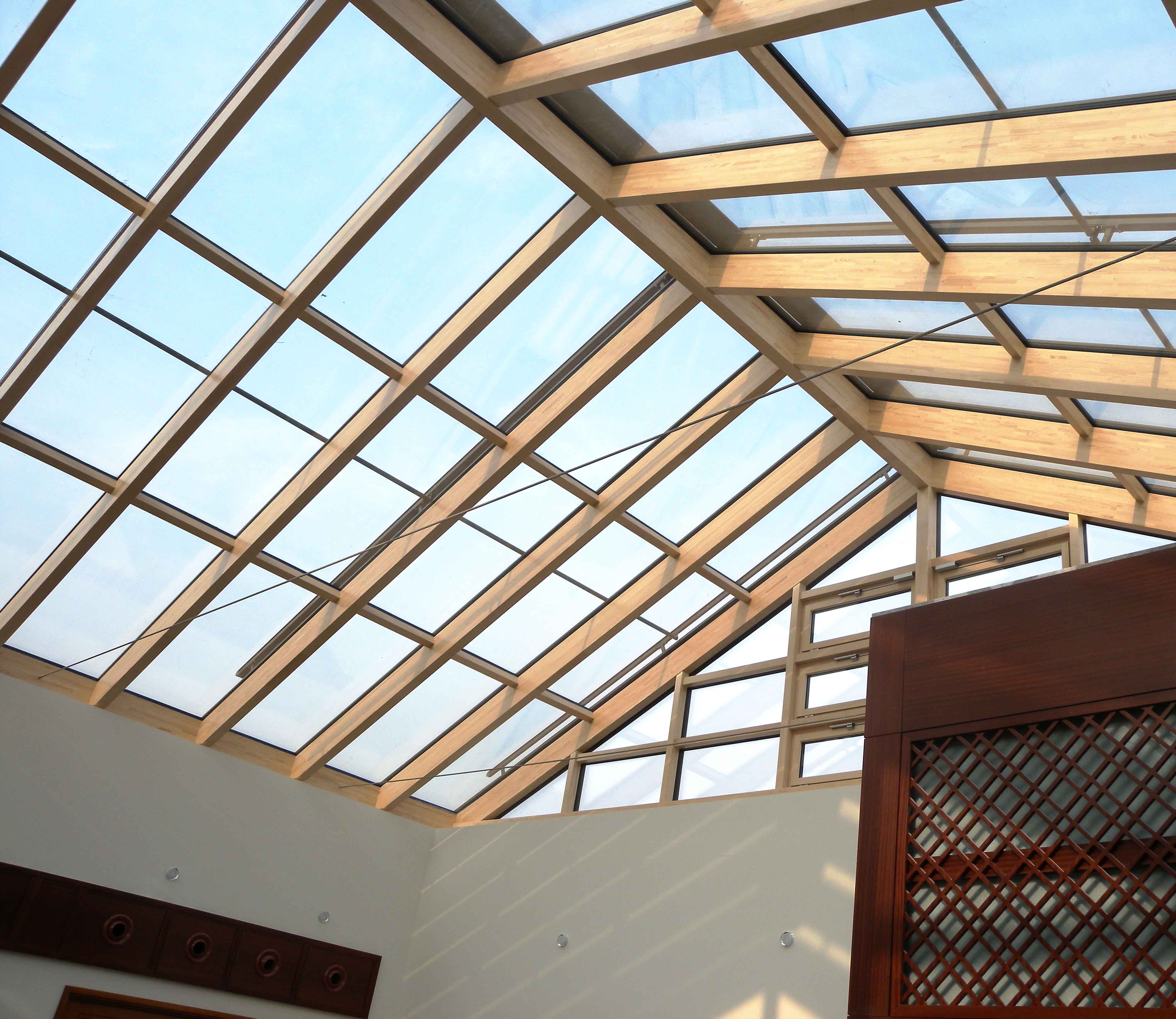 該陽光房位于三層別墅的頂部,平面投影尺寸為11850*9480mm,出于安全考慮,我們對陽光房進行了特殊的抗風壓設計、荷載計算等,同時加大了木材截面尺寸,為提高居住舒適度,我們在南北立面配置了12個電動天窗,并在頂部配置了側滑式天窗和遮陽卷簾,全部實現智能控制。