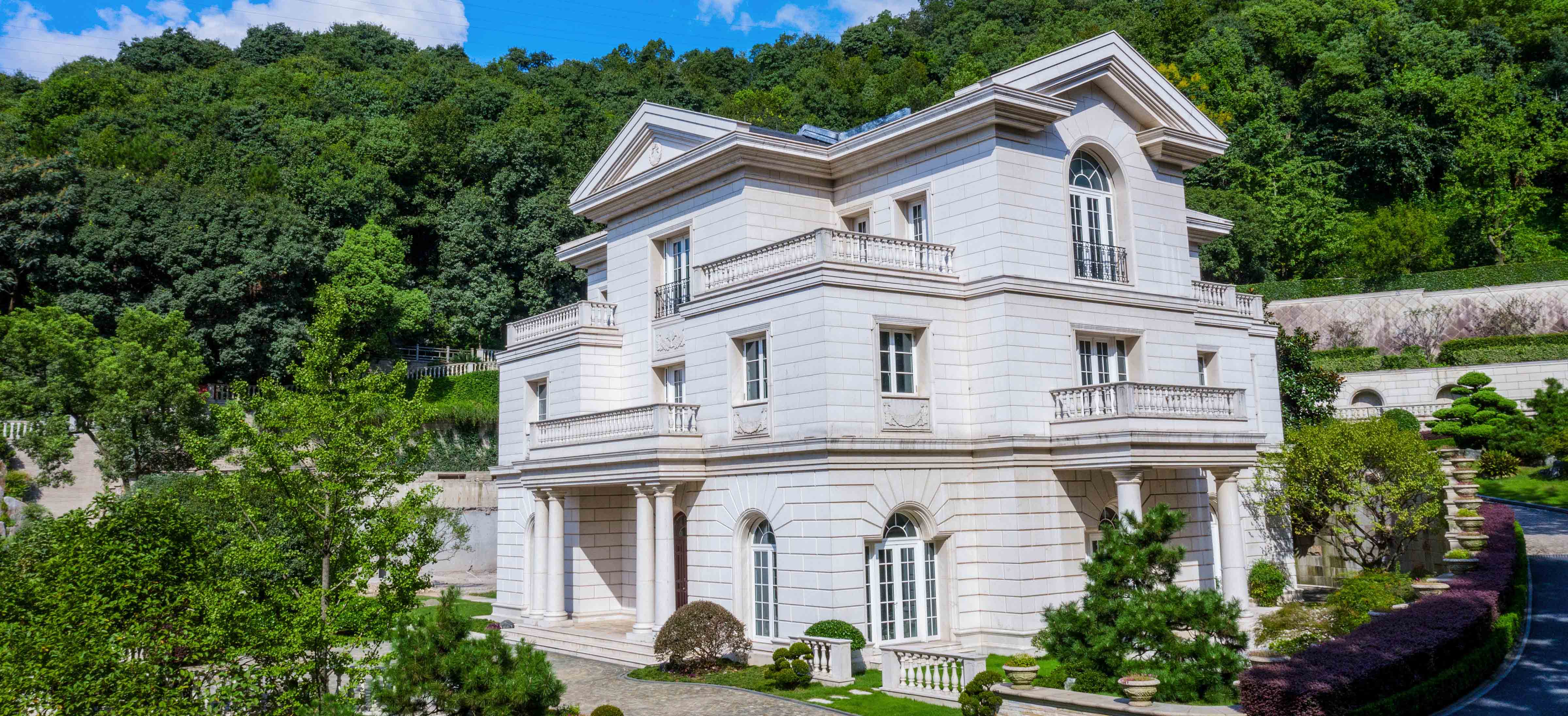 該別墅項目外墻選用進口萊姆石,質地精良,精雕細刻,盡顯王者之氣。進口日本黑松、羅漢松與本土樹種參差搭配,賞心悅目,襯托出一片祥和與寧靜。作為德國高端定制門窗與陽光房系統供應商,漢斯諾克充分發揮技術優勢,并邀請德方設計師全程參與,應用超大弧形窗、T型陽光房等經典造型,與建筑園林完美結合,融為一體,步移景換,彼此呼應,使建筑本身的美學價值卓然出眾。